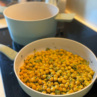 Incorporar los garbanzos, la leche de coco, el caldo, el curry, el garam masala, el comino y la sal.